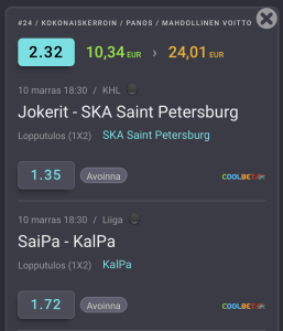 Maanantaista selvittiin pitkästä aikaa puhtain paperein! Nyt jatkuu tuplaukset siis tiistaille ja kohdetarjontaakin löytyy jo erityisesti kiekkopuolella enemmän. Jokereilla on puolet tavallisesta joukkueestaan sivussa SKA:ta vastaan, mikä antaa vieraille jättimäisen etulyöntiaseman. Ennen maaottelutaukoa Liigassa loistanut KalPa puolestaan vierailee SaiPan kotiaskissa Lappeenrannan Kisapuistossa.