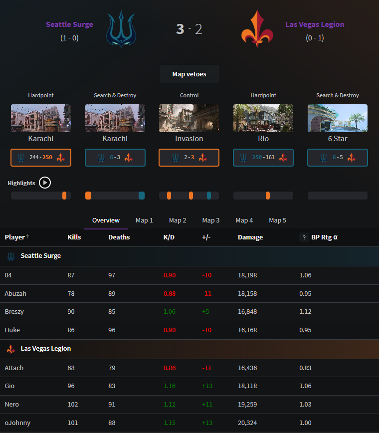Seattle kaatoi ensimmäisessä ottelussaan Las Vegas Legionin lukemin 3-2. Voitetuista kartoista kaksi kolmesta tuli varsin selvin lukemin ja hävityt kartat päättyi erittäin pienten marginaalien turvin, joten kokonaisuudessaan Seattlen voidaan sanoa pelanneen vahvan ottelun. Vaikka FaZe on jokaisessa pelimuodossa äärimmäisen kova, on Seattlellä mahdollisuudet yllättää varsinkin hardpointissa sekä search and destroyssa. Tulivoimassa Seattle jää kakkoseksi, mutta vahva tiimityöskentely ja oikeat taktiset ratkaisut on ollut suurin syy joukkueen menestyksen taustalla.