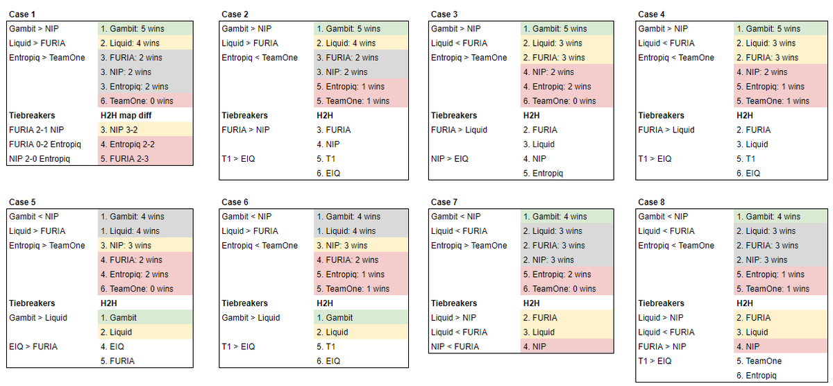 Kumpikaan joukkueista ei ole ennakkosuosikin asemassa omissa otteluissaan, ja lohkon kolmannella ottelullakin on merkitystä siinä, kuka lohkon kolmannelle sijalle lopulta kipuaa. Onneksi HLTV:n journalisti Milan ”Striker” Svedja on kasannut alle suhteellisen yksinkertaisen kaavion, josta selviää jokaisen mahdollisen tilanteen vaikutus lohkon lopulliseen järjestykseen.