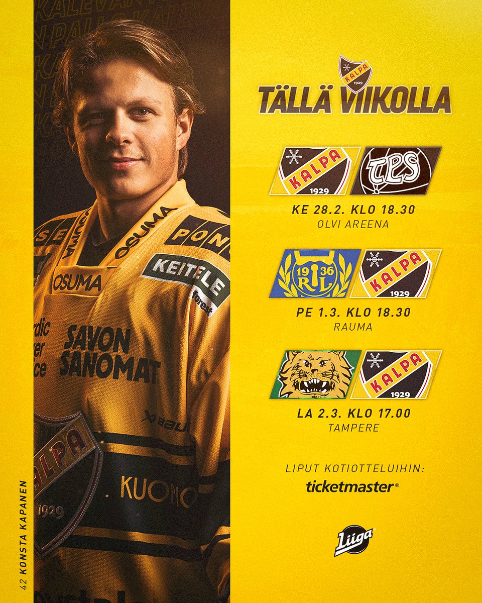 Keskiviikkona 28.2. klo 18.30 alkaen taistellaan TPS:aa vastaan kotikaukalossa ja viikonloppu viiletetään vierasjäällä.