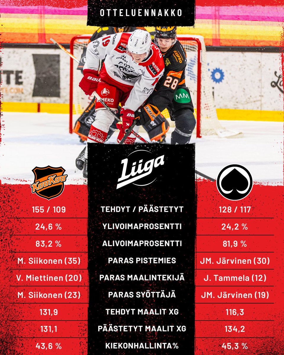 Taistelu paikoista neljän parhaan joukkoon käy kuumana ja kuudennelta sijalta löytyvällä KooKoolla on pullat hyvin uunissa. Yläpuolelta löytyvät Ilves, SaiPa sekä Lukko ovat kolme pistettä edellä, mutta KooKoolla on peräti kolme ottelua vähemmän pelattuna. KooKoo hävisi hiljattain Kiekko-Espoolle sekä Pelicansille, mutta molemmissa otteluissa se oli maaliodottamien valossa niskan päällä. Perään on nähty kolme laadukasta voittoa Kiekko-Espoota, Ässiä sekä TPS vastaan ja verkko heilui yhteensä peräti 15 kertaa.