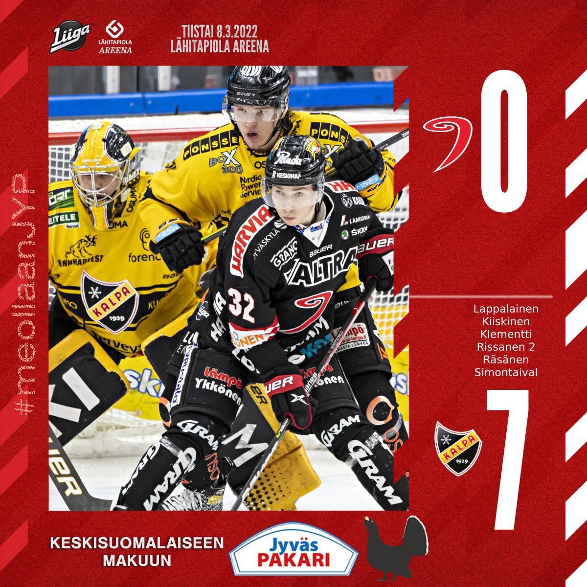 Jukka Ahvenjärvi ja kumppanit toivovat luultavasti, että kausi päättyisi jo. JYPin pelaaminen on karmeaa ja joukkue vaikutti ainakin eilen kadottaneen viimeisenkin terän kulmahampaistaan. 0–7-lukemin pataan kotona KalPaa vastaan ei mairittele jyväskyläläisiä, kun pitäisi taistella pisteistä TPS:ää vastaan vieraissa ja heti perättäisenä pelipäivänä.