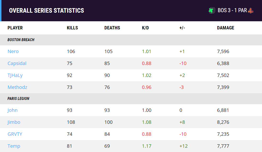 Bostonin osalta oli paljon kysymysmerkkejä kauden alla ja kun kausi starttasi, joukkue näytti epäilijöille. Aivan kärkeen asti ei ole vielä riittänyt, mutta tasaisen varmaa suorittamista ja vaikka Boston lähtisi altavastaajana, ei sitä voi koskaan laskea täysin ulos kisasta. Avausottelu meni tuloksellisesti varsin odotetusti, kun Paris Legion kaatui lukemin 3-1. Controllissa Paris oli kuitenkin vahvempi eikä viides kartta olisi ollut vääryys.